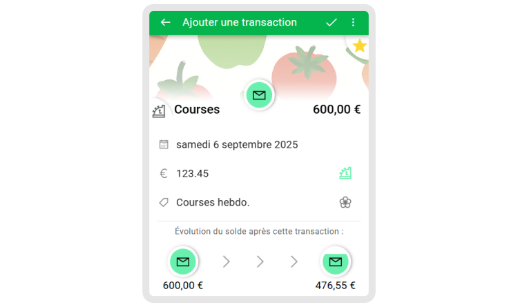 Choisissez la couleur, l’icône ou même une image pour chaque enveloppe : votre budget devient vraiment le vôtre.